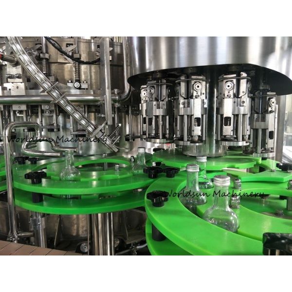 The bottles are transferred to the three in one filling machine by the bottle air supply system through the bottle shifting star wheel. A bottle clamp is installed on the rotary table of the bottle washing machine. The bottle clamp clamps the bottle mouth and turns it 180 ° along a guide rail to make the bottle mouth downward. In the specific area of the bottle washing machine, the nozzle sprays bottle washing disinfectant or water to wash the inner wall of the bottle. After the bottle is washed and drained, it is clamped by the bottle clamp and turned 180 ° along the guide rail to make the bottle mouth upward. The washed bottles are led out from the bottle washing machine through the bottle shifting star wheel and transmitted to the filling machine. The bottle entering the filling machine is stuck at the bottle mouth by the bottleneck support plate. The filling valve is lowered and raised by the valve lifting mechanism under the action of cam. Pressure filling is adopted for filling. After the filling valve drops and contacts the bottle mouth, it opens to complete the filling process. After filling, the filling valve rises and leaves the bottle mouth. The bottle enters the capping machine through the transition pulley of the bottle neck. The rotation stop knife on the capping machine blocks the bottleneck to keep the bottle upright and prevent rotation. The capping head keeps rotating and rotating on the capping machine, and realizes the actions of grasping, covering, screwing and removing the cap under the action of cam to complete the whole capping process. The finished bottles are transferred from the capping machine to the bottle delivery chain through the bottle delivery wheel, and the three in one bottler is transferred by the conveyor chain. The whole equipment is sealed by window sealing, the height of the window sealing is higher than the equipment Zui high point, appropriate channels are reserved at the bottle inlet and outlet, and exhaust slots are reserved at the bottom of the window sealing.